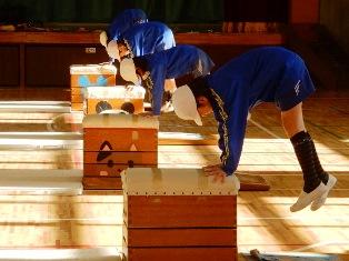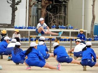 3年生は体育の跳び箱の練習です。まずは、踏切板でジャンプ。
