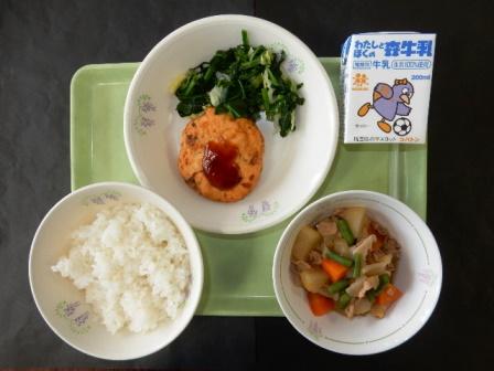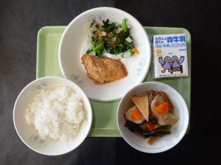 ごはん、飛龍頭、春菊の和え物、ぶた肉と大根の煮物、牛乳です。