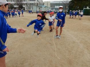 1年生は体育で、短縄を使って二重跳びに挑戦しています。