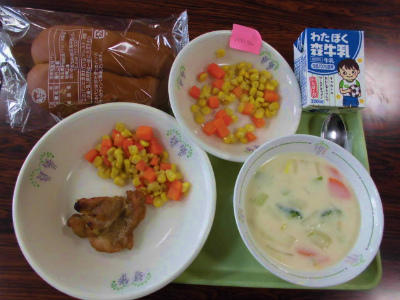 子どもパン、牛乳、メンチカツ、ゆでキャベツ、中華スープ