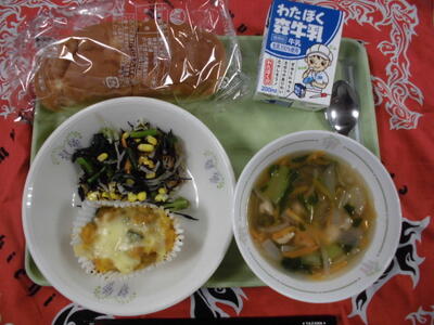 本日の給食7月7日(火)さっぱりした味です ズッキーニとトマトのスープ