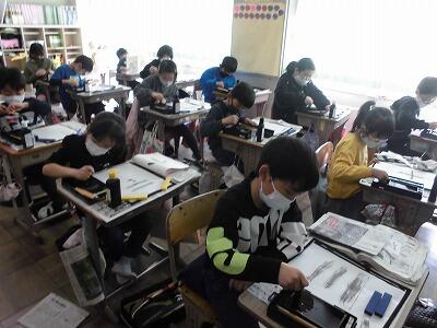 4年生の教室は、どのクラスも集中が見られ、授業に入り込んでいます。自分で調べていく社会など頑張っていました。