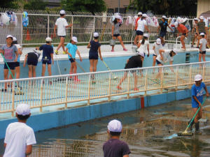 今年度の水泳学習に向け、6年生と教職員によるプール清掃が