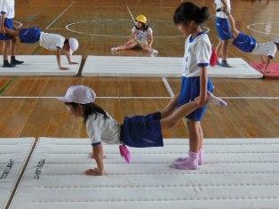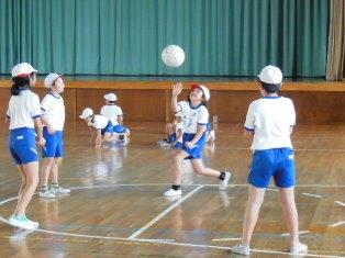 4年生の体育の様子で、ビーチボールのような軽いボールを使って