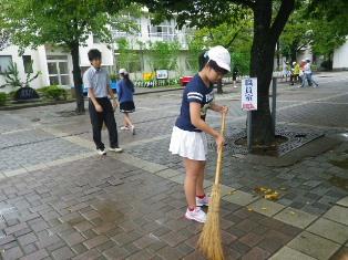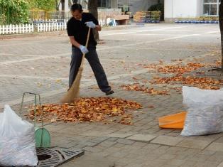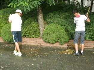 管理棟前の落ち葉を掃いているのは、6年生のボランティア