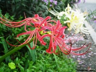 垣根の下には、いつの間にか紅白の彼岸花が咲いています。