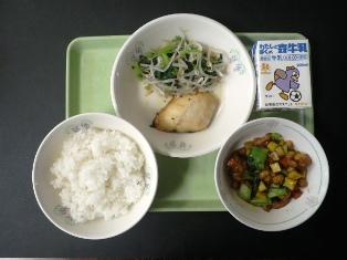ごはん、さわらの西京焼き、おひたし、大豆の五色煮、牛乳です。