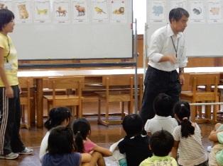 うさぎ小屋の前では、業務主事さんを子どもたちが囲んでいます。