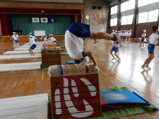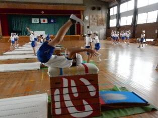 内容は、跳び箱の台上前転です。手の位置とか足の位置とか、