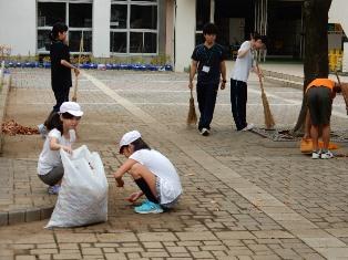 校門を入った中庭では、6年生の子どもたちが桜の落ち葉を掃除しています。