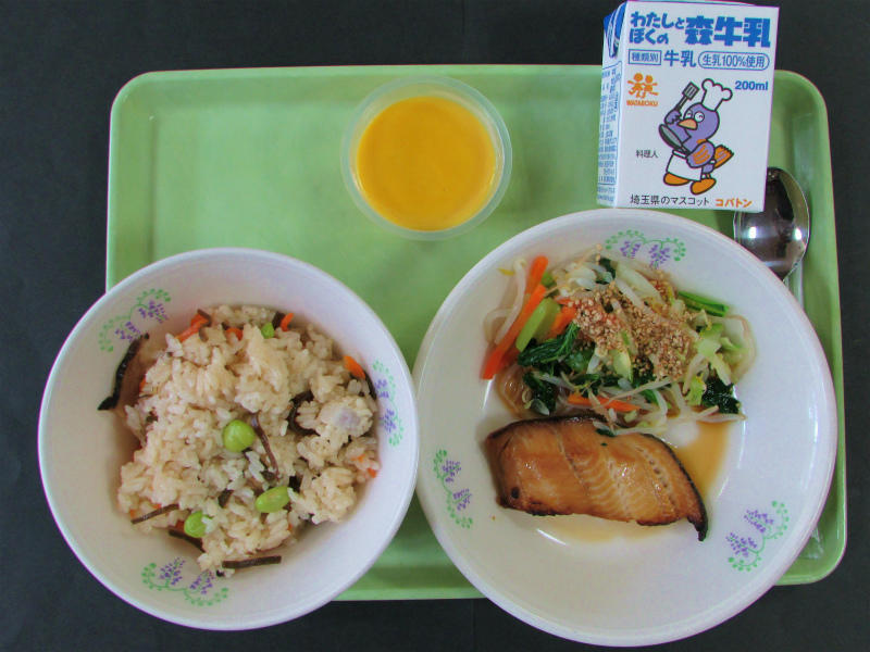 今日は、「ハロウィン献立」で「吹き寄せごはん」「牛乳」