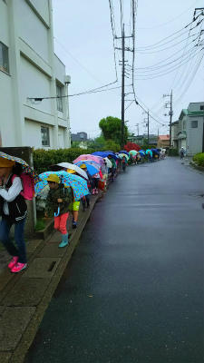 あいにくの雨での登校でしたが、一列で安全に登校できました。