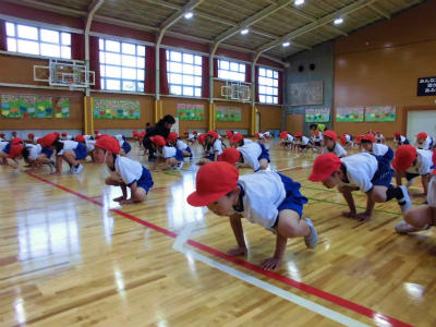 1年生合同で、体育館での体育。かえる倒立がんばっています。