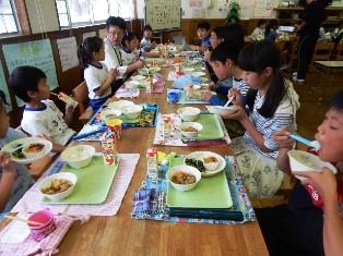 6年1組と3年1組の交流給食の様子です。6年生が手際よく