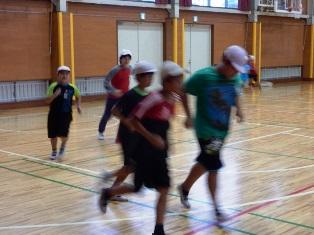 雨で校庭が使えないため、体育館を走る子どもたちです。