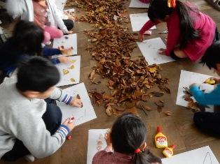 2年生は図工で、落ち葉を使って作品を制作しています。
