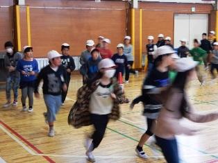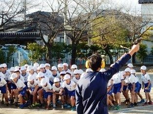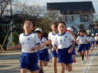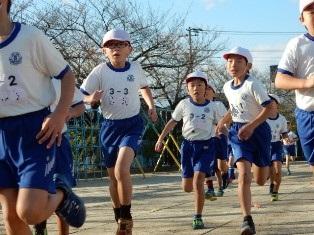 昨日の雪で校庭が使えないため、体育館を周回する子どもたちです。