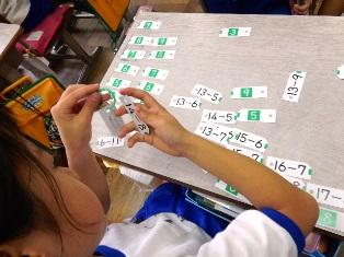1年生は算数で、二ケタひく一ケタの計算のやり方をカードで