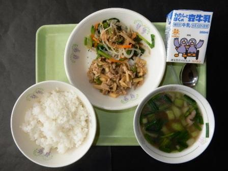 ごはん、チンジャオロースー、ナムル、中華スープ、牛乳です。