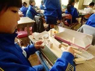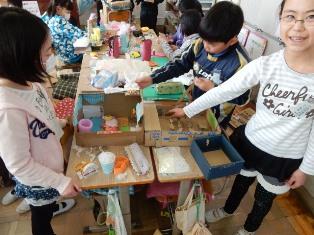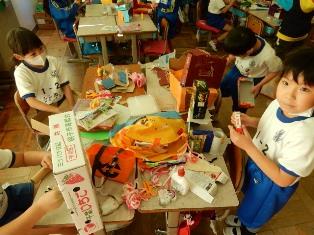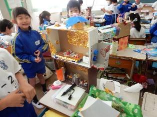 1年生は図工で、空き箱などを使って作品を制作しています。