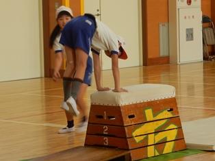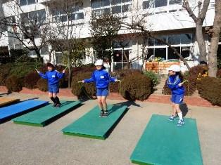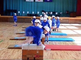 マラソン前に、新しいジャンプ板で練習している子どもたちです。
