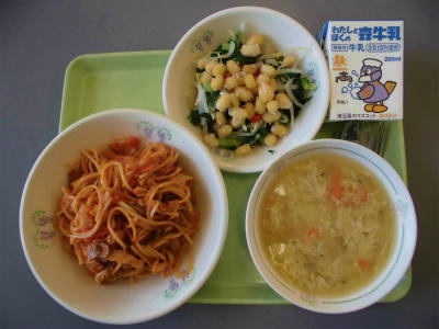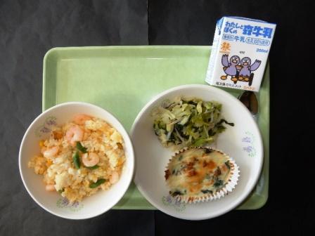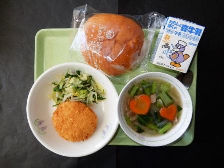こどもパン、さけチーズコロッケ、みずなサラダ、春雨スープ、牛乳です。