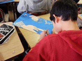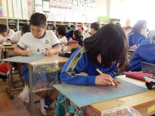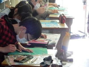 6年生の様子です。集中して丁寧に彫り、刷っています。