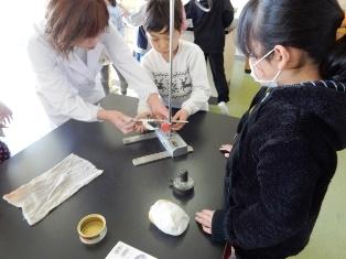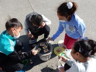 5年生は理科で、食塩とミョウバンの水溶液を蒸発皿に入れて