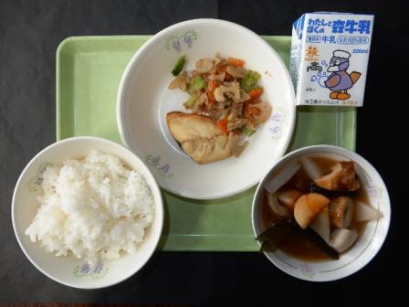 ごはん、さばの塩焼き、れんこんのきんぴら、みそおでん、牛乳です。