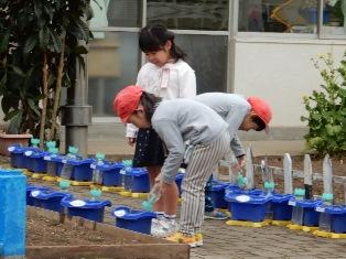 チューリップの芽が伸びてきて、1年生はうれしそうです。