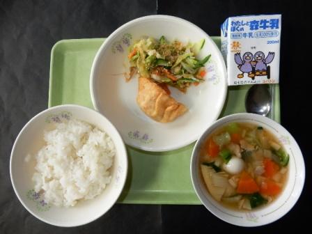 こぎつねごはん、アジフライ、大根のごま酢和え、おすいもの、牛乳です。