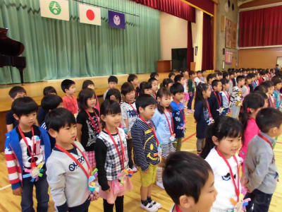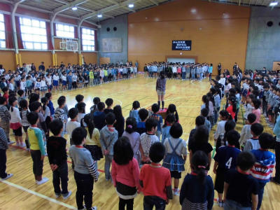 全校で心を一つにして、校歌を歌いました。1年生も上手に歌っていました。