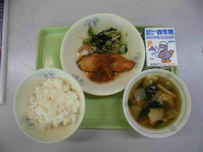 ごはん、牛乳、鮭の野菜あんかけ、磯香和え、田舎汁
