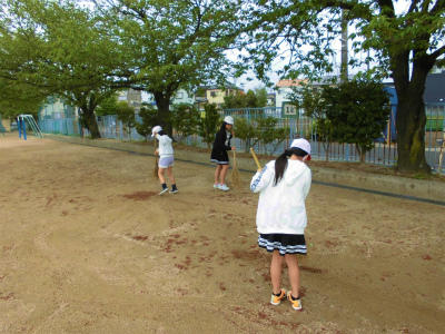 校庭では、ほうきを持って掃いてくれています。