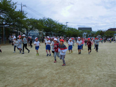 朝マラソン、音楽が流れると、みんな一生懸命走っていました。