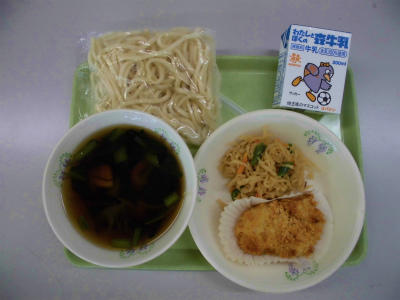 地粉うどん、牛乳、おかめうどん、白身魚のこんがり焼き、切り干し大根のきんぴら