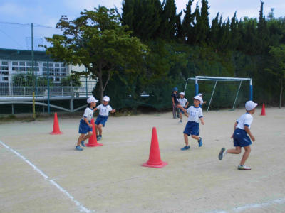 4年生はカラーコーンの周りを回ってリレーを行っています。