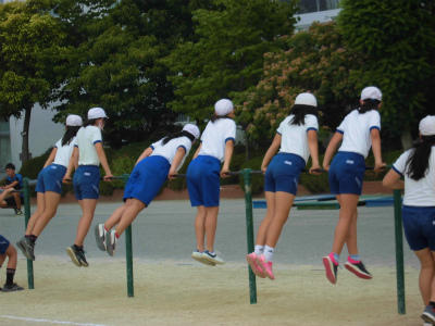 6年生は、リングの中を素早く飛び抜ける運動や鉄棒で腕を支持する運動を行っています。