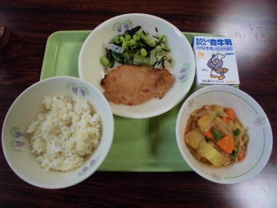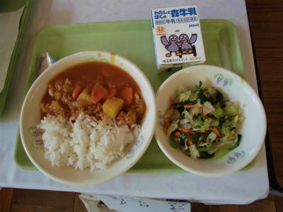 給食のメニューは、カレー、麦ごはん、牛乳、チンゲンサイとジャコのサラダ でした。