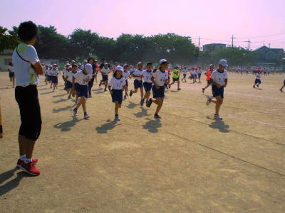 暑さの中、朝から元気に5分間マラソンを行いました。精一杯走る子どもの姿に大人が元気になります。