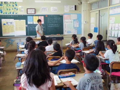 2年生。5時間目の算数もしっかり集中して参加しています。本校では、板書に力を入れて指導を展開しています。