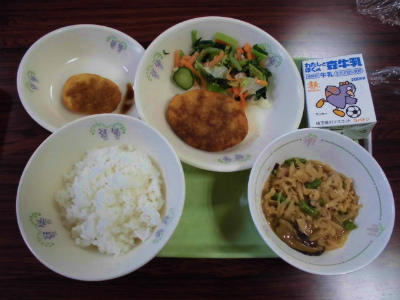 ごはん、牛乳、ゼリーフライ、彩の国サラダ、切り干し大根の煮物
