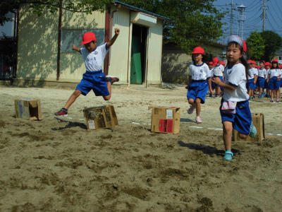 砂場で大きくジャンプ!段ボールを飛び越します。走力と跳躍力を高めます。