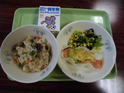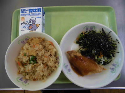 こぎつねごはん 牛乳 あじの新玉ねぎソース 磯香和え