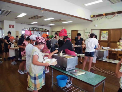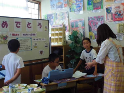 お誕生日給食では、高学年の子どもたちが給食当番。進行役は給食委員会。牛乳で乾杯もします。