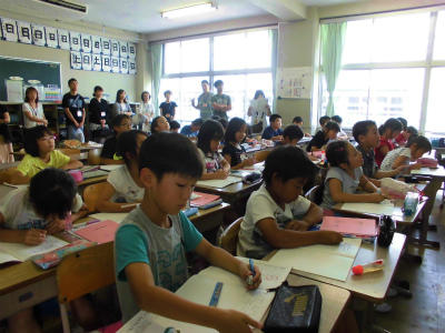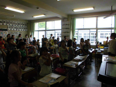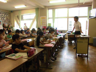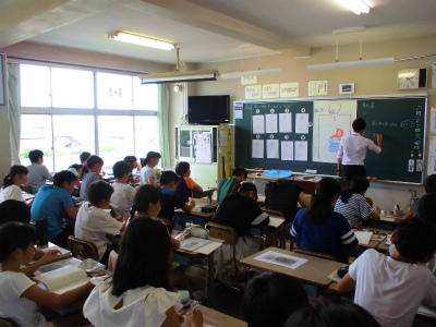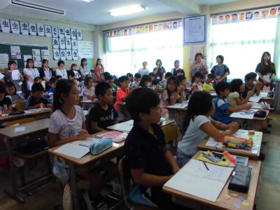 3年生英語活動。JTEと担任が二人で授業を進めます。映像を見ながら学習しています。