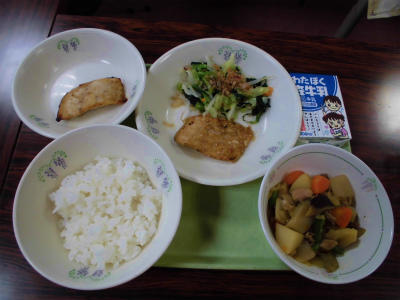 ごはん、牛乳、さばの七味焼き、小松菜のおかか和え、肉じゃが