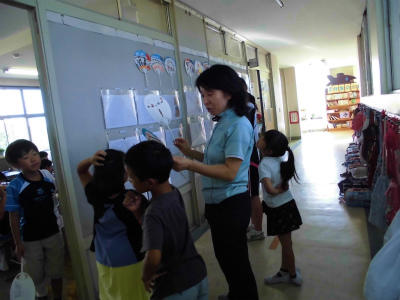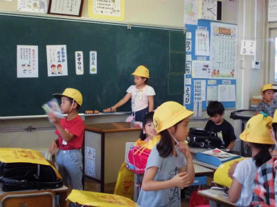 1年生は5時間で終了です。帰りの会では、明日の予定を黒板に貼りだし、帰りの支度をしています。スムースにできるようになっています。