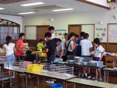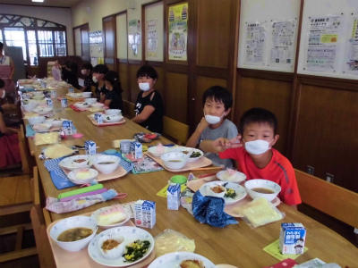 ランチルームでの給食、とても嬉しそうです。高学年の児童が給食当番です。