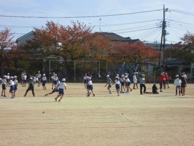 6年生の朝は学校のために働くことから始まります。最近では落ち葉はきをしている児童が多く見られます。仕事の後は、走っている低学年児童に混ざってマラソンです。